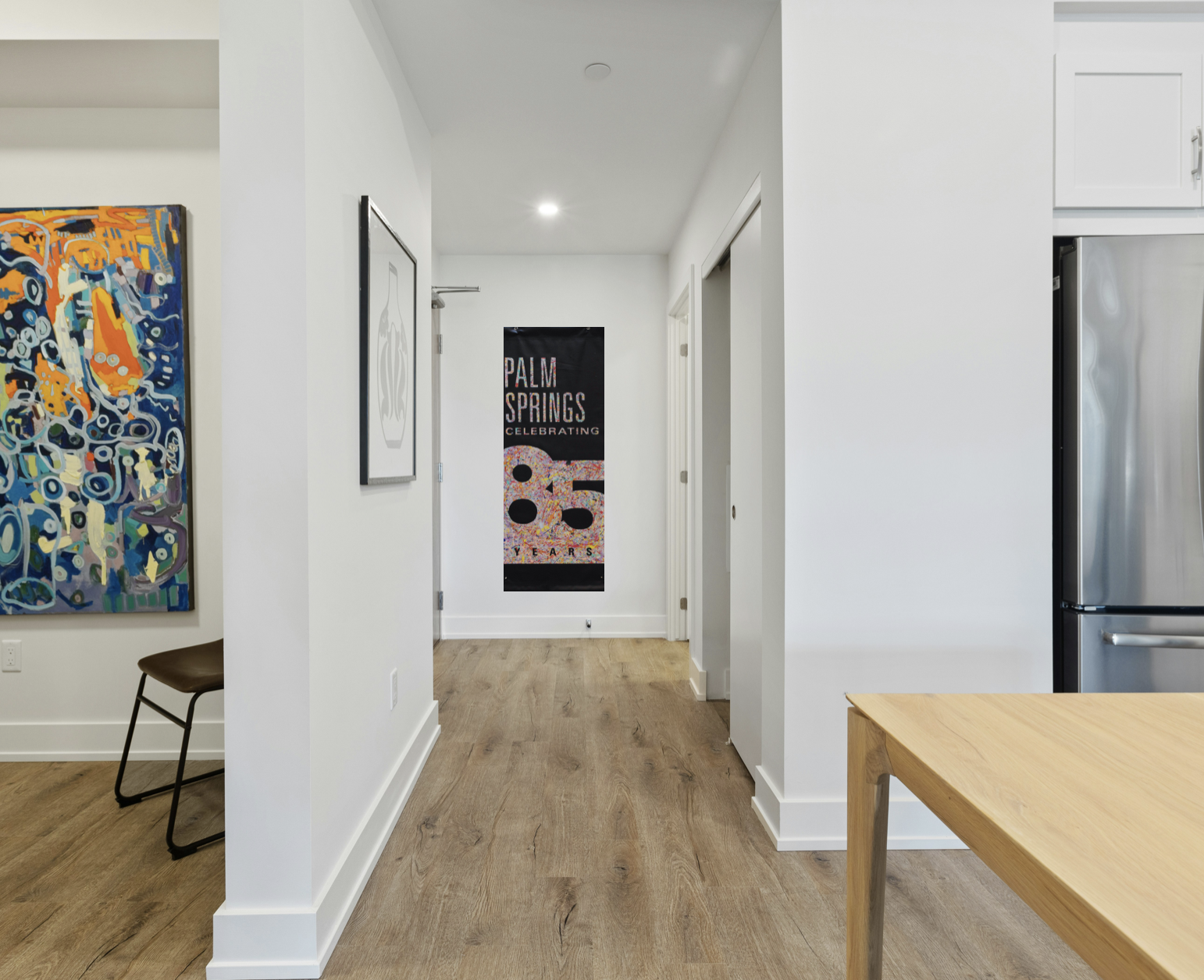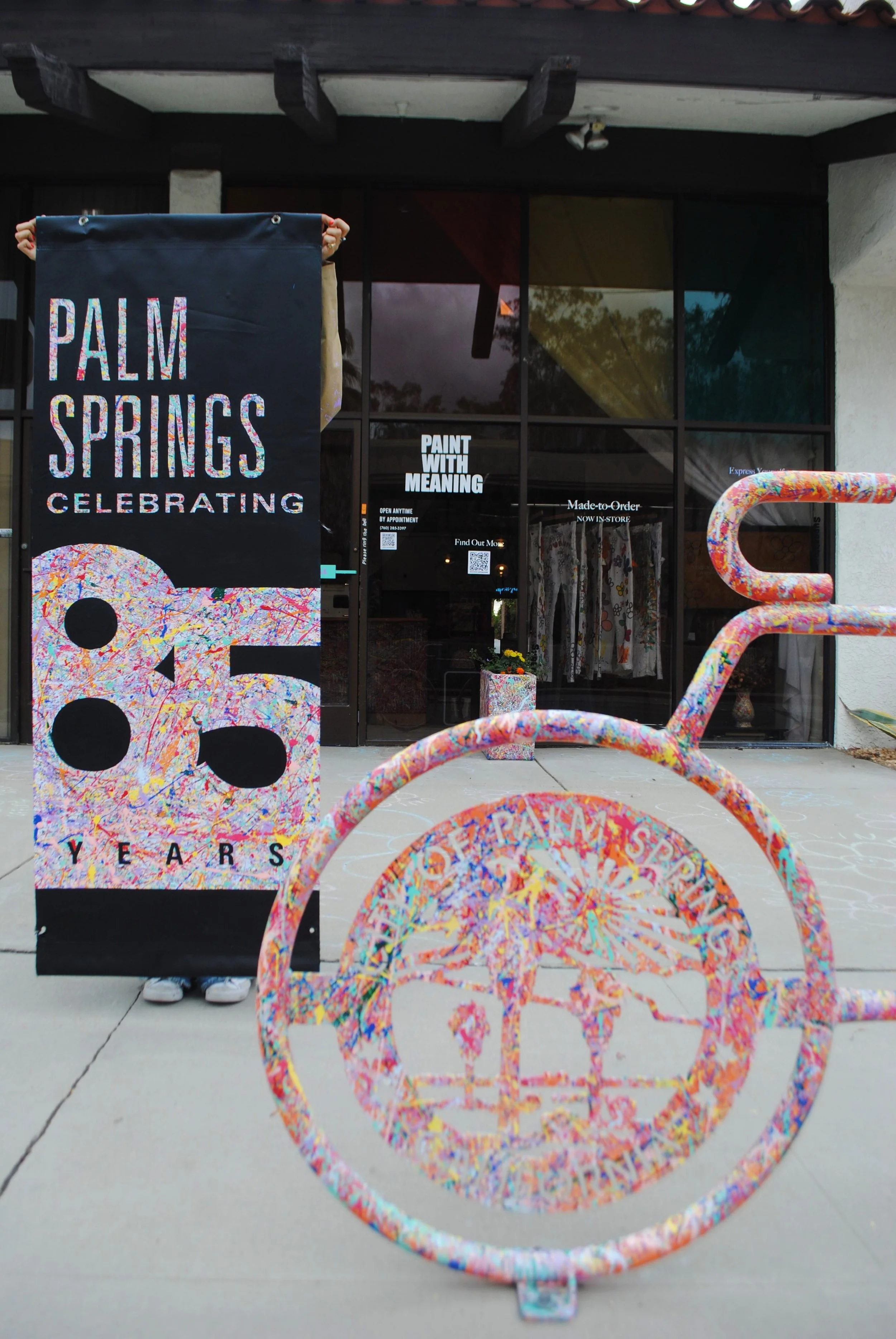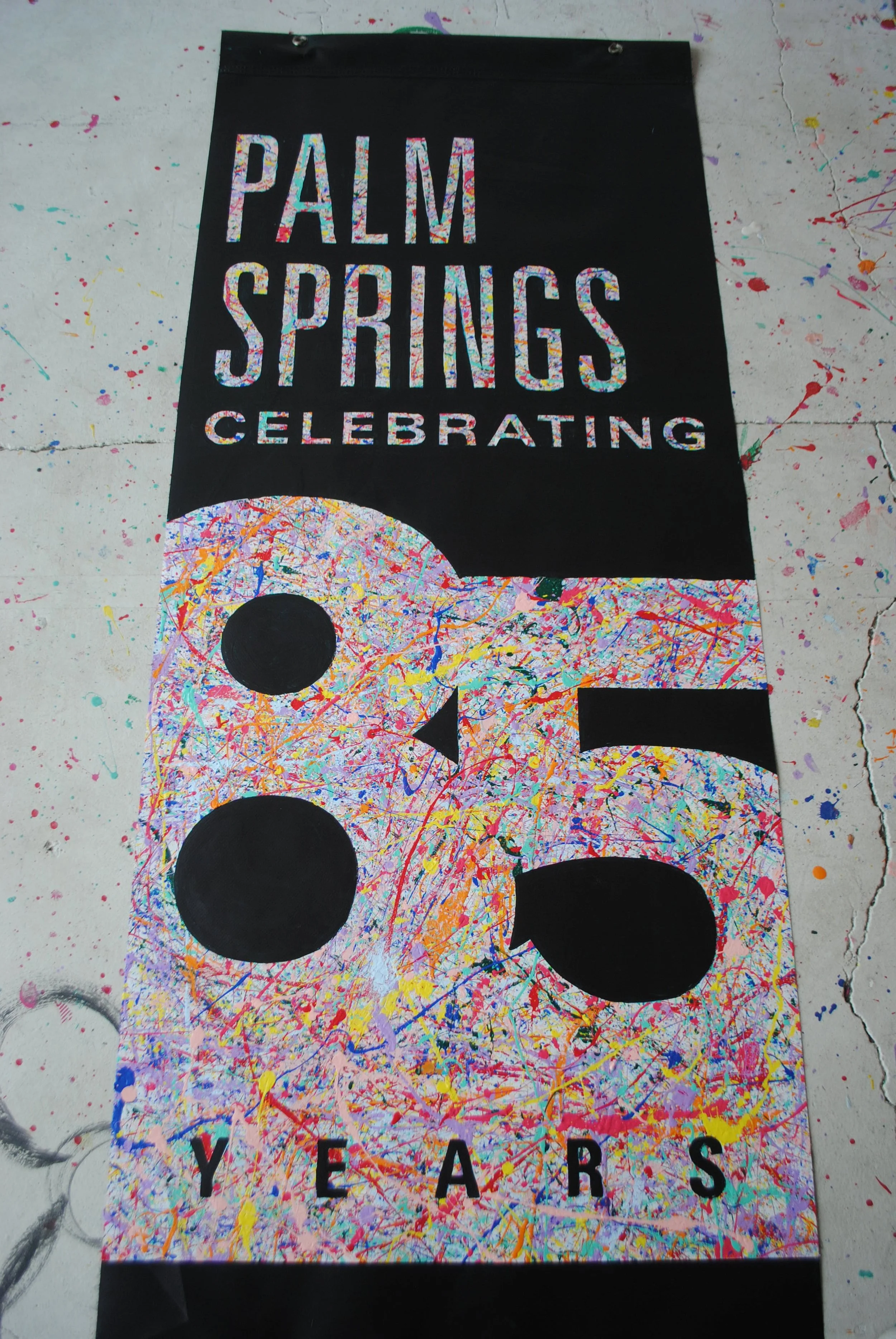 Introducing Palm Springs 85 Years, a celebratory 1 of 1 upcycled Superbloom banner of our city. This colorful piece captures the essence of Palm Springs’ vibrancy with bold text painted in Superbloom's iconic 10-color signature paint splatter. Set against a sleek black backdrop, the Superbloom hues of the text pop, creating a captivating tribute to the city's 85 years of legacy and a colorful and inclusive future ahead.